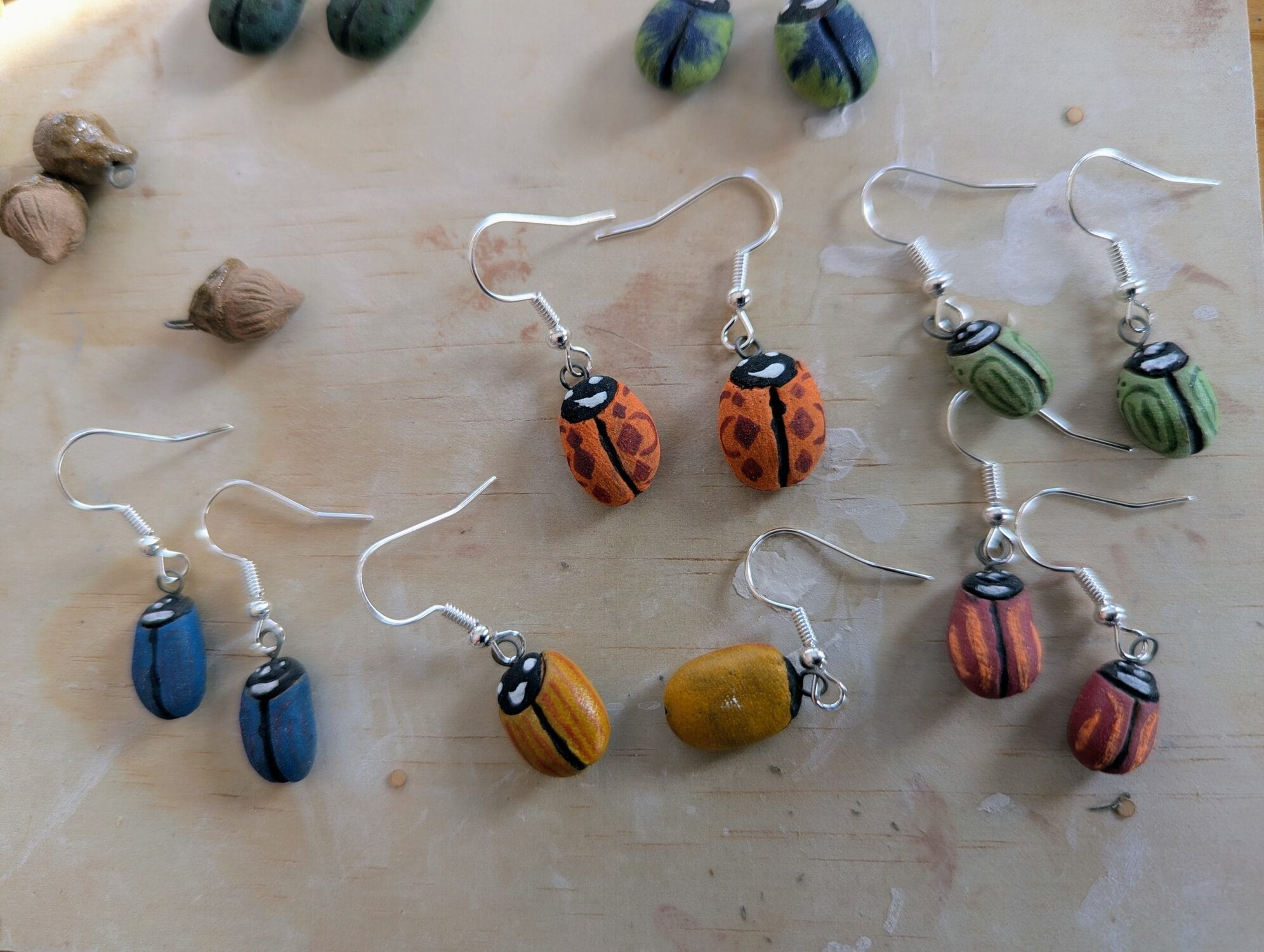 Scarabées, tasses, poissons, glands miniatures. Couleurs diverses.