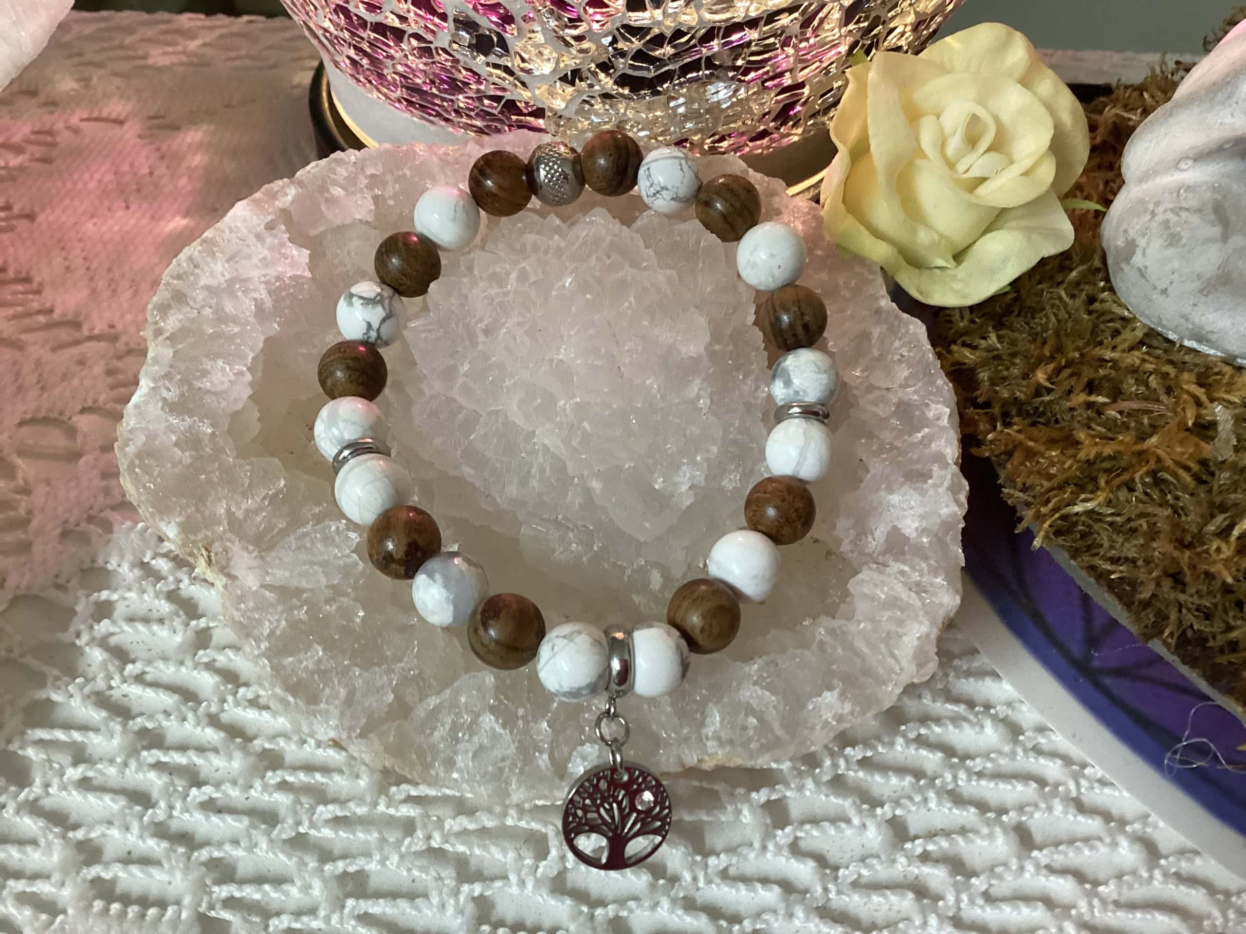Pierres semi-précieuses en howlite et bois , breloque acier inoxydable