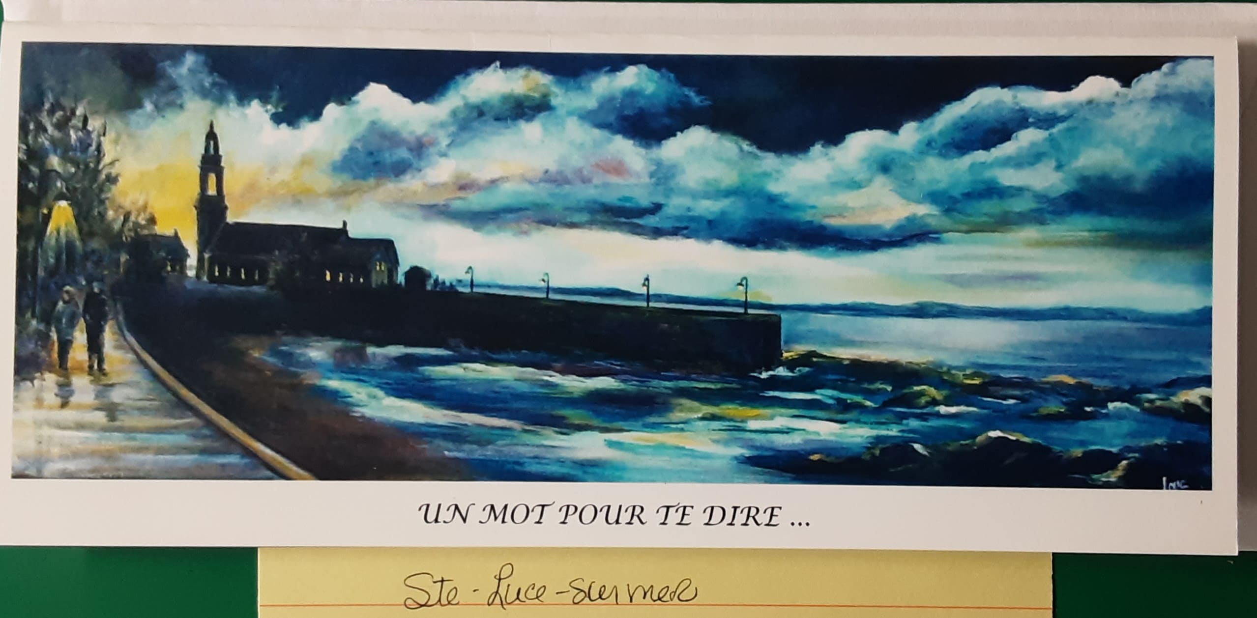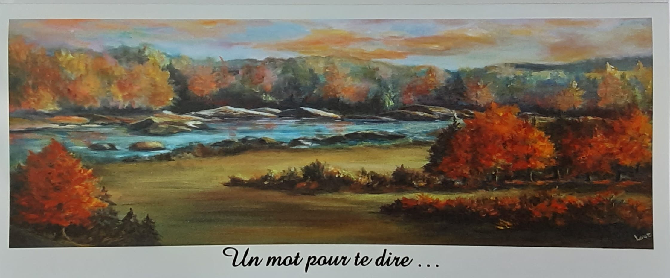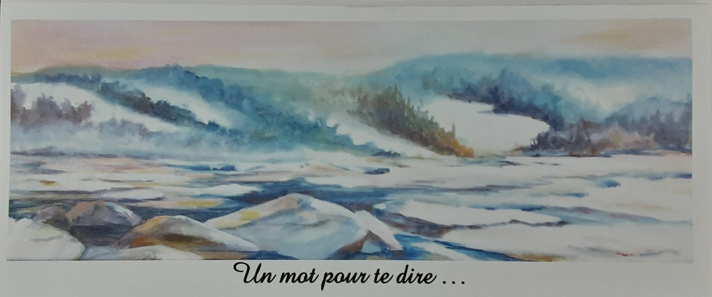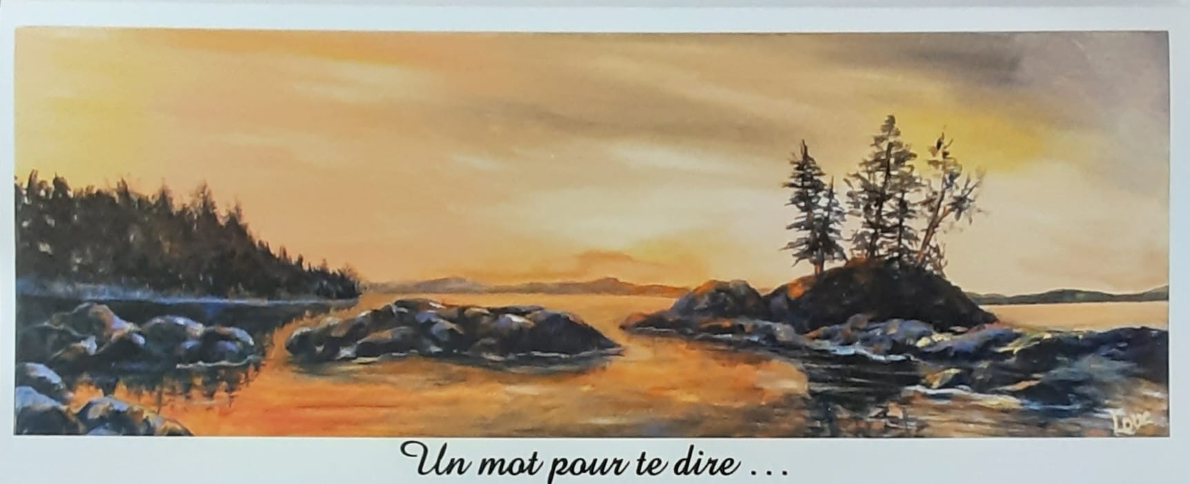 Reproductions d’oeuvres de l’artiste Louise Champagne. Format allongé. Grandeur 10cm par 23 cm. incluant l’enveloppe blanche et la feuille protectrice. Écriture: “Un mot pour te dire” sur le dessus. Sans écriture à l’intérieur. Possibilité d’avoir de grandes quantités avec préavis. Autres modèles disponibles auprès de l’artiste.
