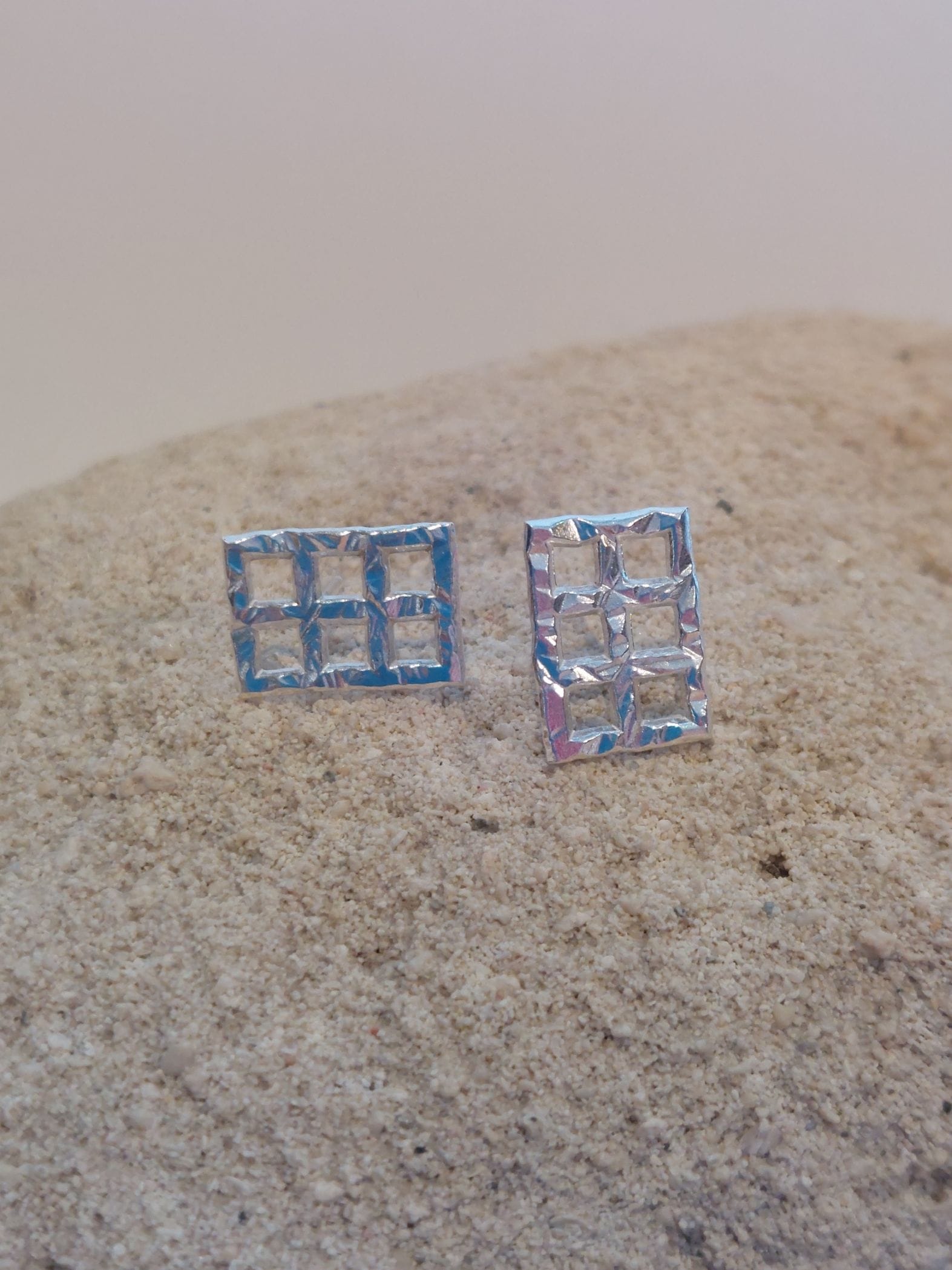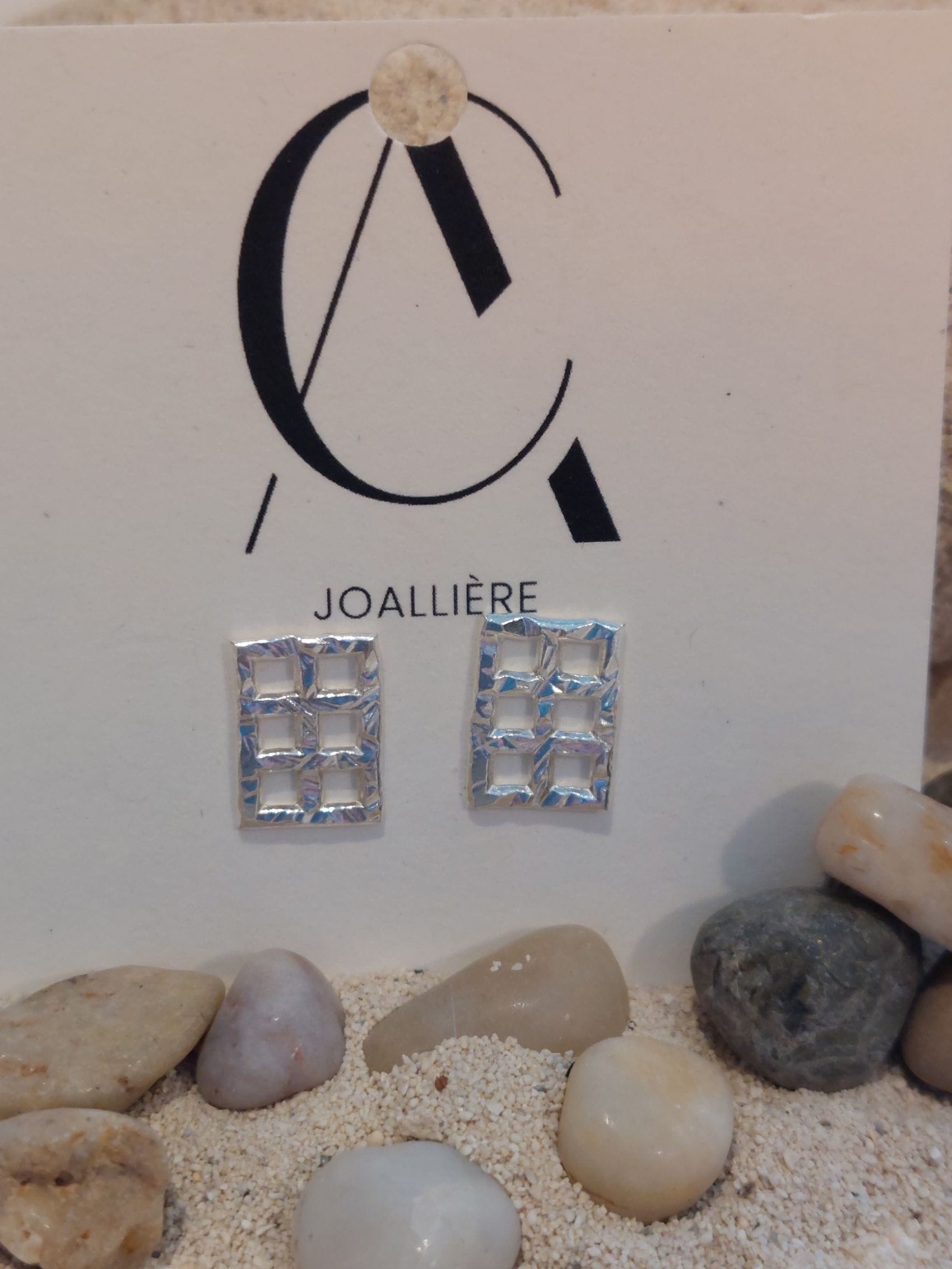 Boucles d’oreilles sur tiges faites d’argent 925. Elles sont constituées de 6 petits carrés qui ont été martelés à la main. Elles conviennent à toutes les occasions.