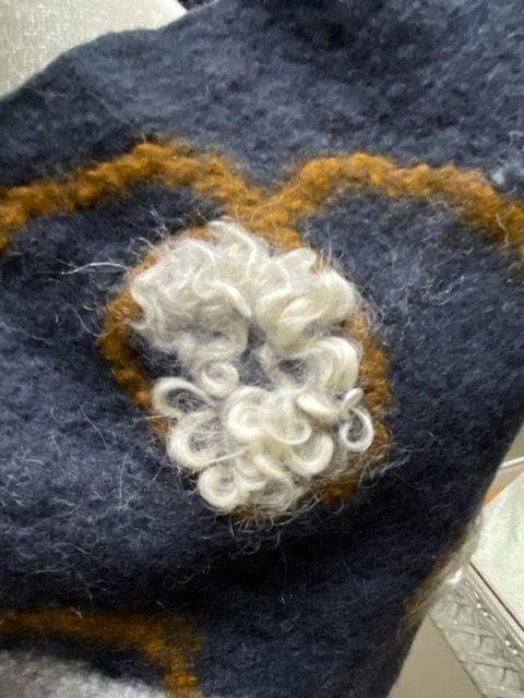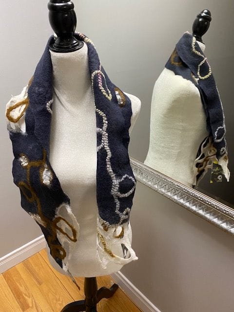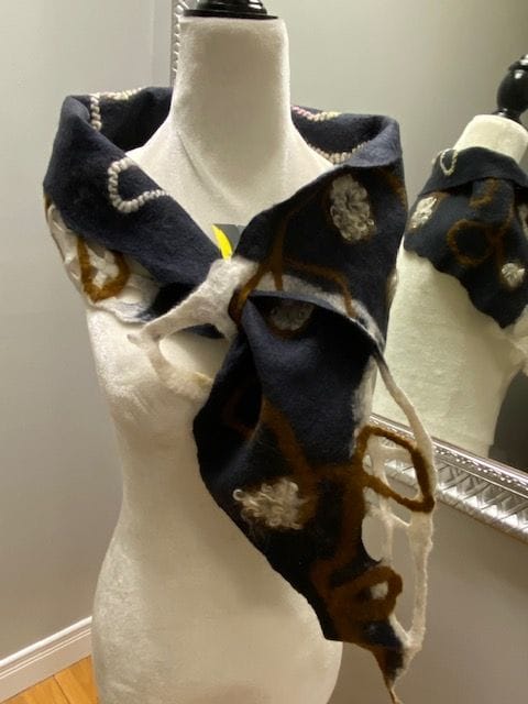 foulard gris de laine mérinos avec des ajouts de laine ocre et blanche