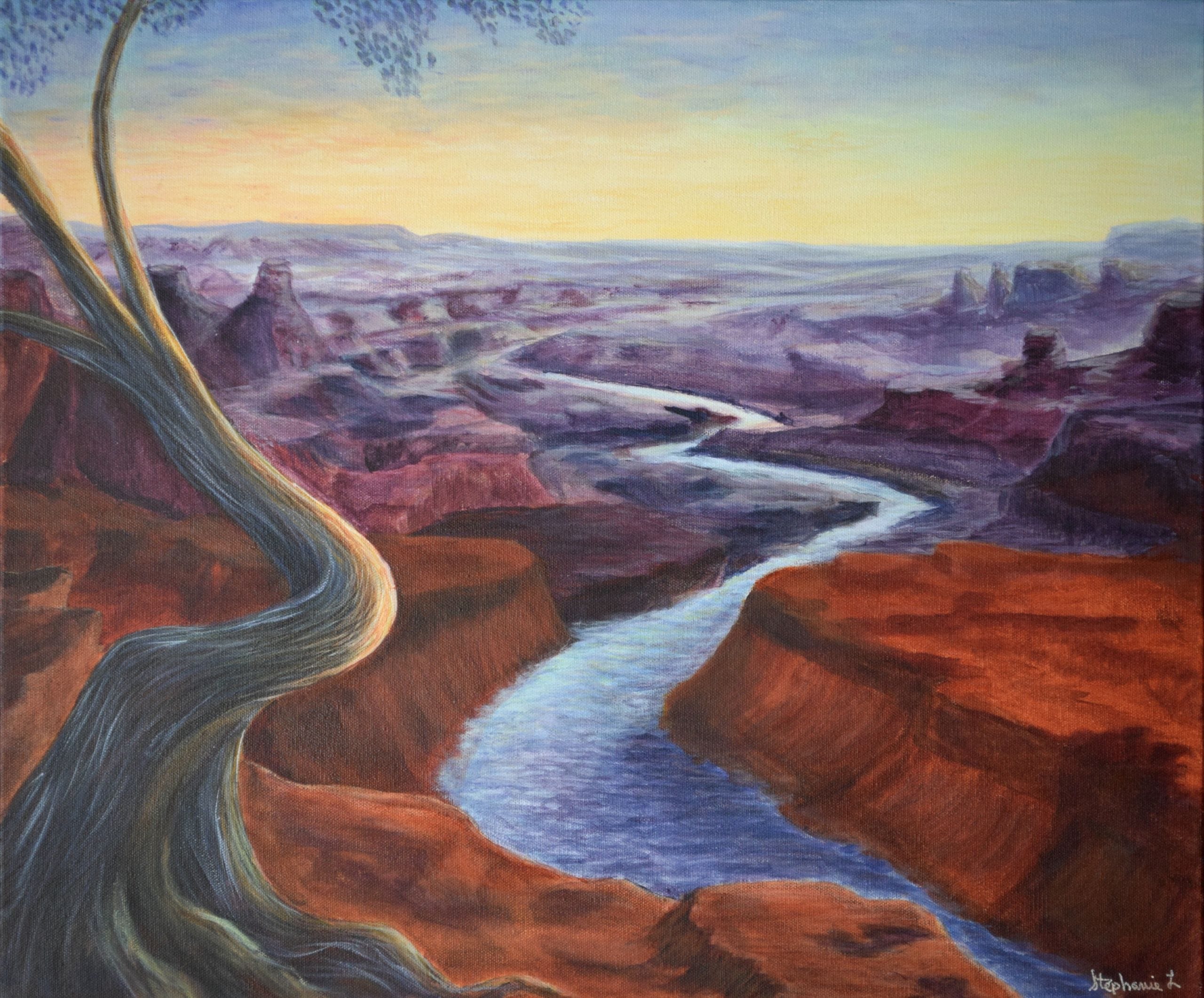 Mon œuvre La douceur du roc, évoque un paysage de canyon où le temps est symbolisé par l’érosion douce de la rivière qui sculpte la roche et se fraye un chemin en créant des formes uniques, tandis qu’un arbre s’intègre harmonieusement à ce décor puissant, illustrant la résilience, la persévérance et l’adaptation de la nature