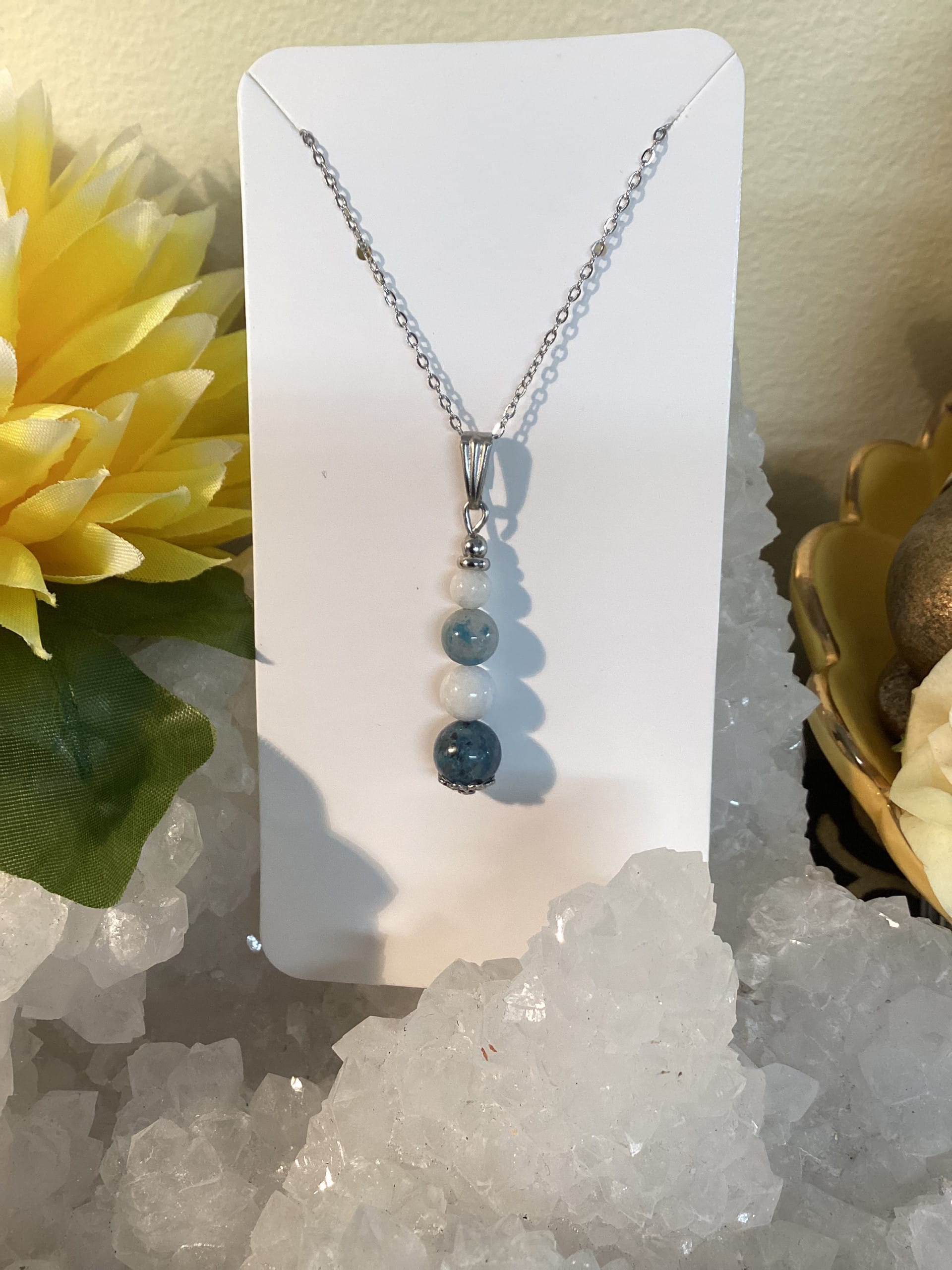 Pendentifs en pierres naturelles de trolleïte et célestite sur chaîne acier inoxydable.