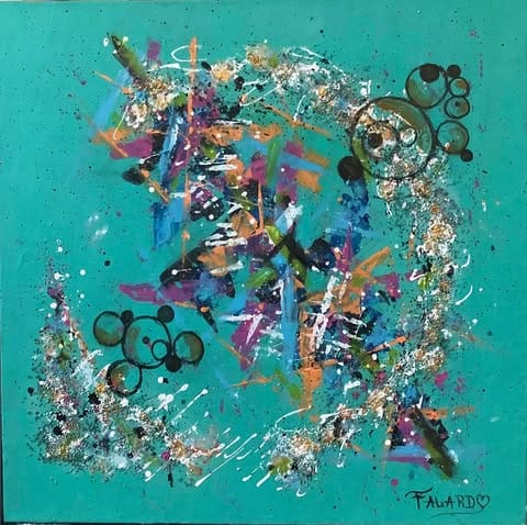 Un tourbillon de lumière sur fond turquoise, où chaque éclaboussure semble née d’une collision galactique. Les couleurs s’entrechoquent comme des nébuleuses en fête, et les formes rondes, espiègles, jouent les constellations familières dans un ciel réinventé. C’est une danse cosmique où le chaos devient harmonie,
