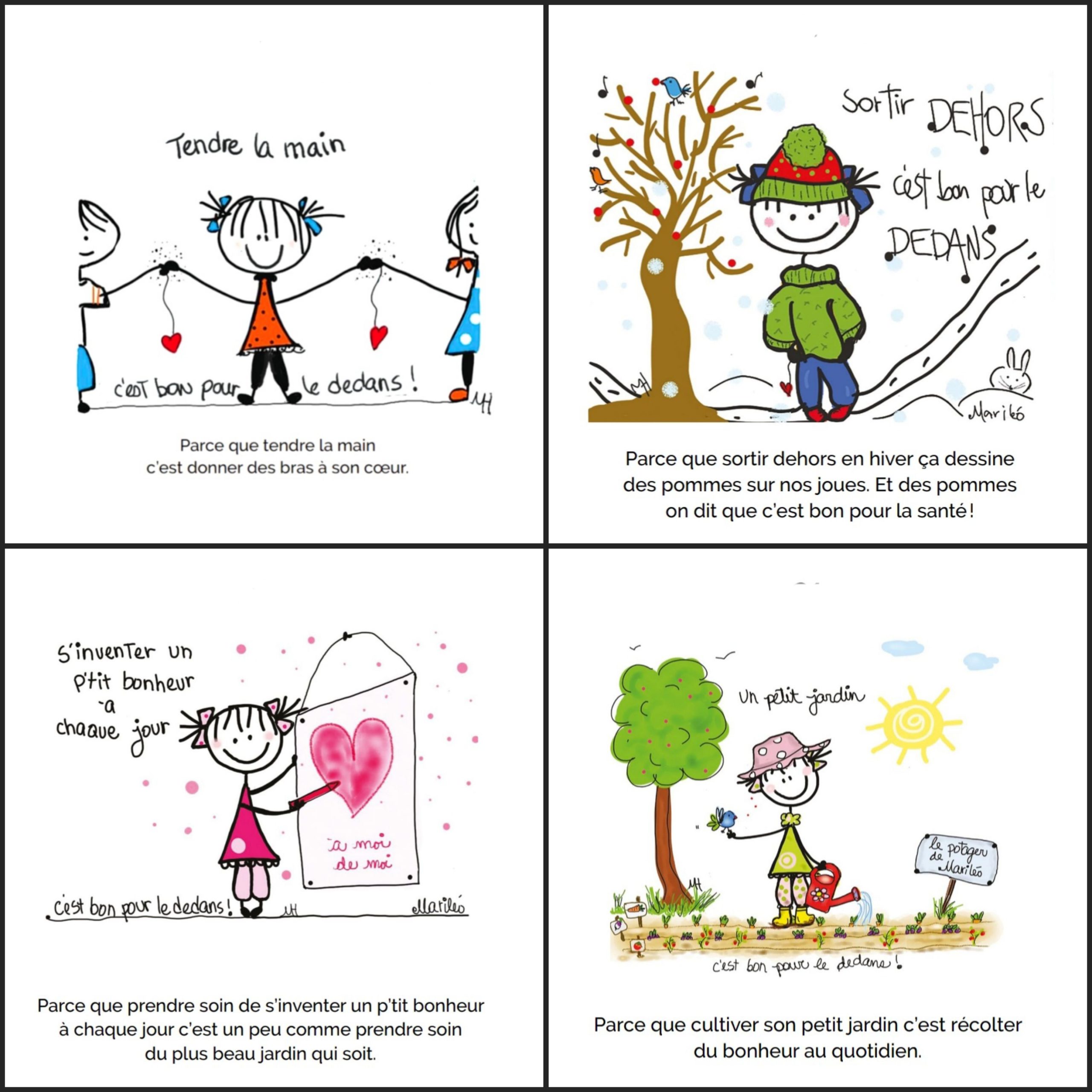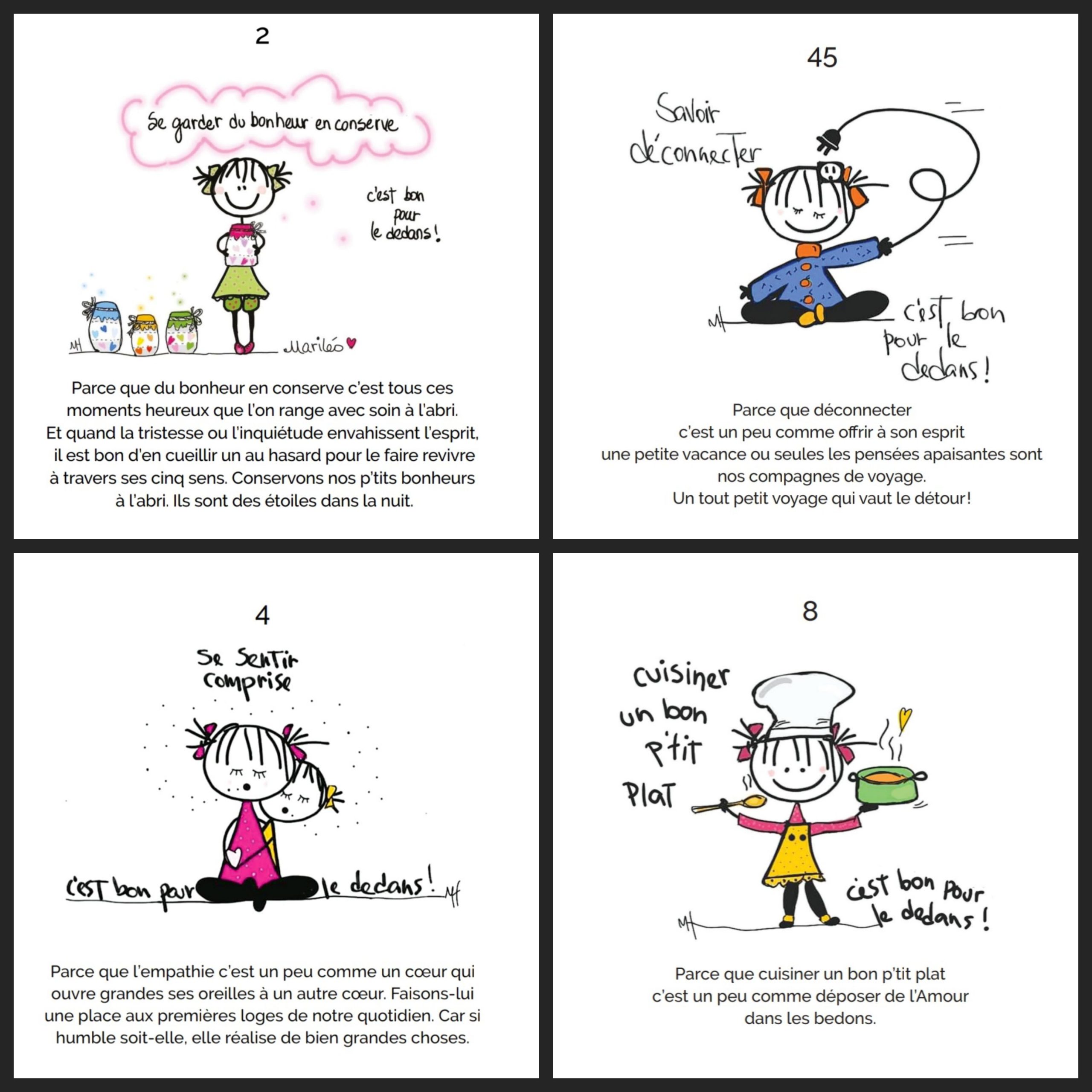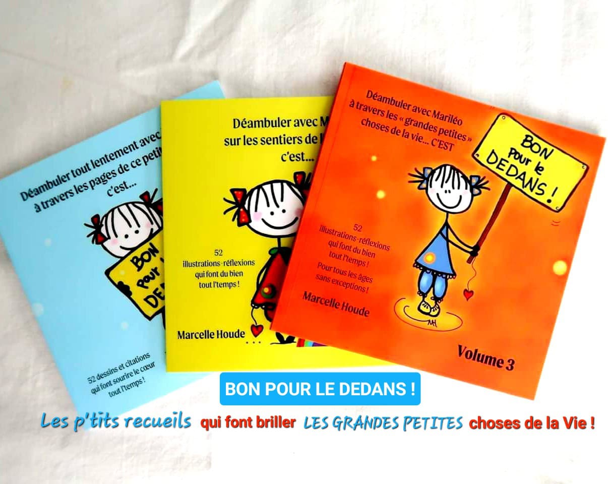 Petits recueils (Vol 1-2-3) regroupant chacun 52 illustrations réflexions du petit personnage de Mariléo qui a le don de faire briller les grandes petites choses de la Vie. Ces recueils s’adressent à tous les groupes d’âges (de la petite enfance à nos aînés)