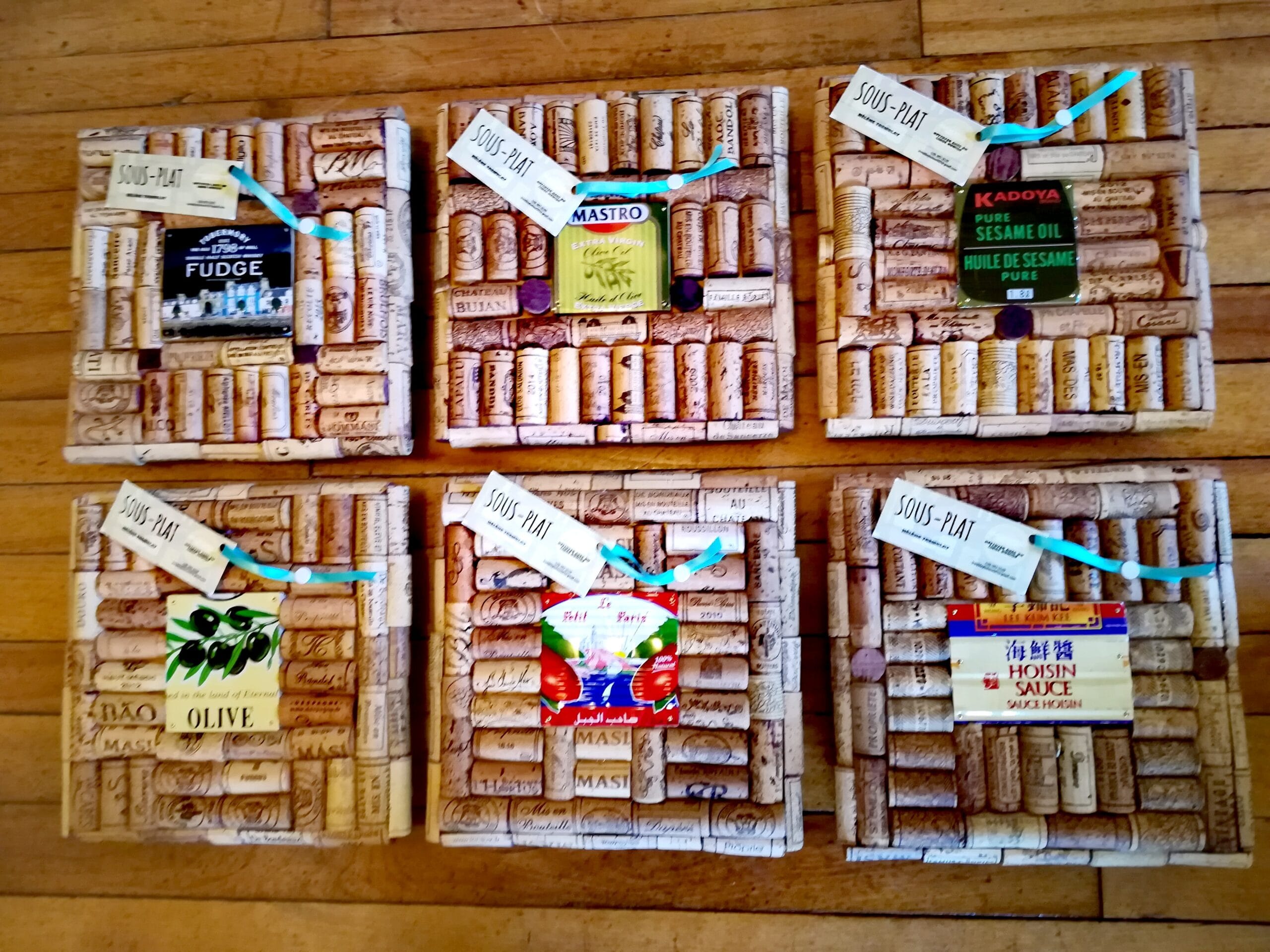 Sous plat fait de matières recyclées tel que bouchons de liège et boîtes de métal