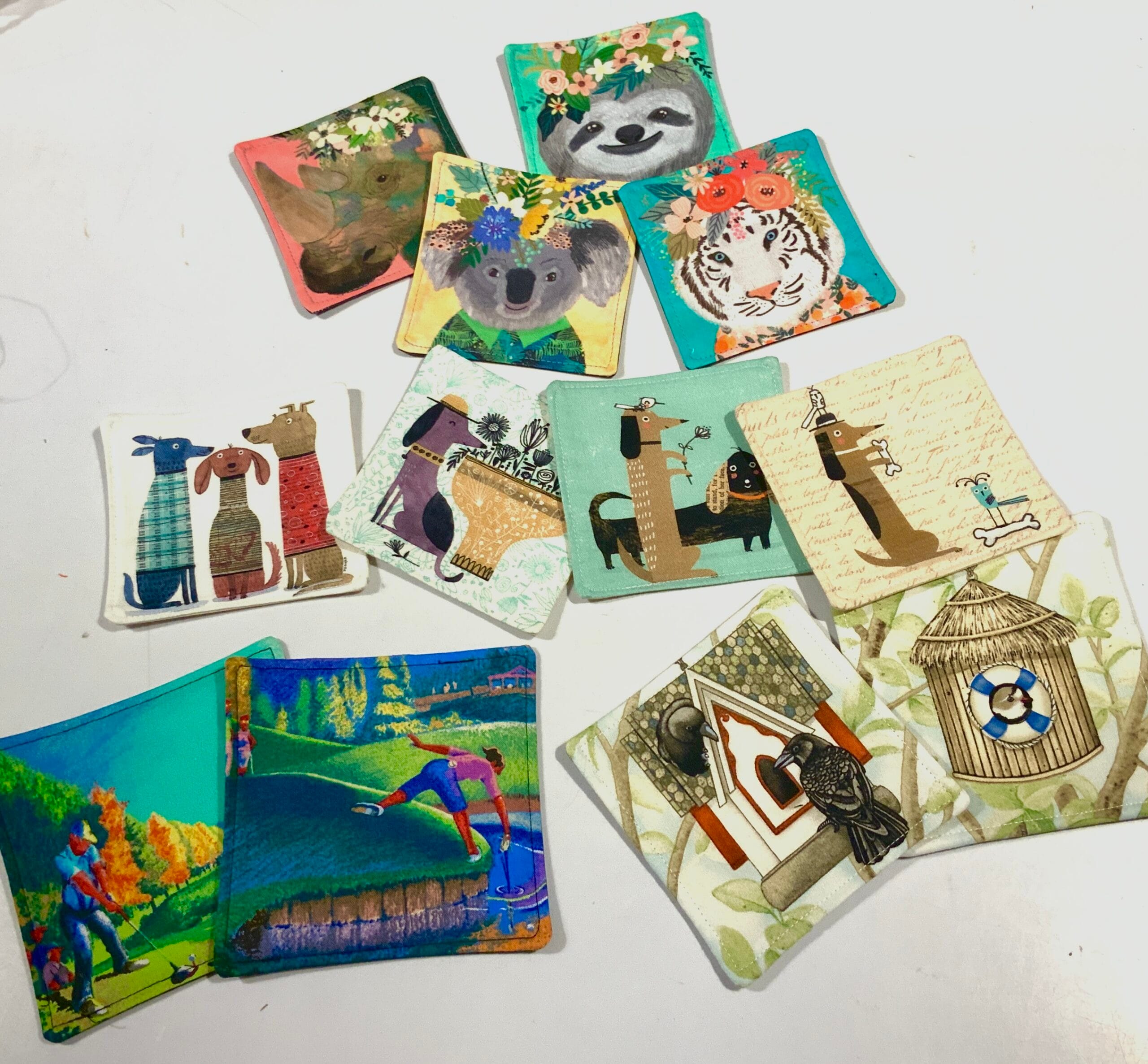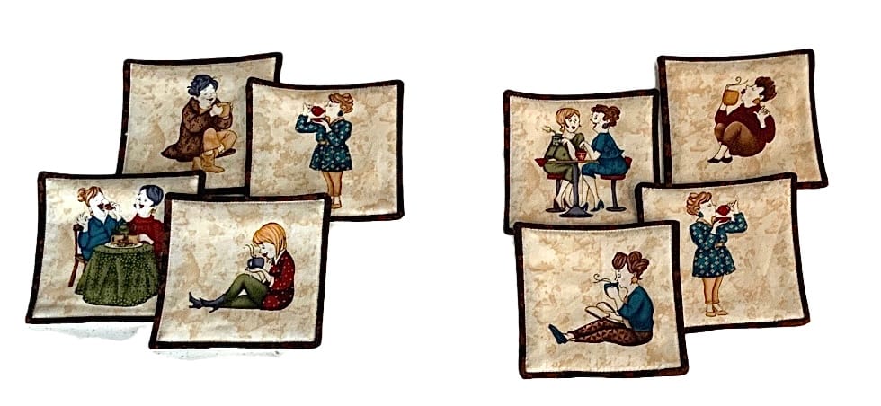 Sous-verre avec 2 épaisseurs de coton et une épaisseur de flanelle à l’intérieur. Ils protègeront à merveille vos dessus de table. Plusieurs motifs disponibles: femmes buvant du café, golfeurs, chats