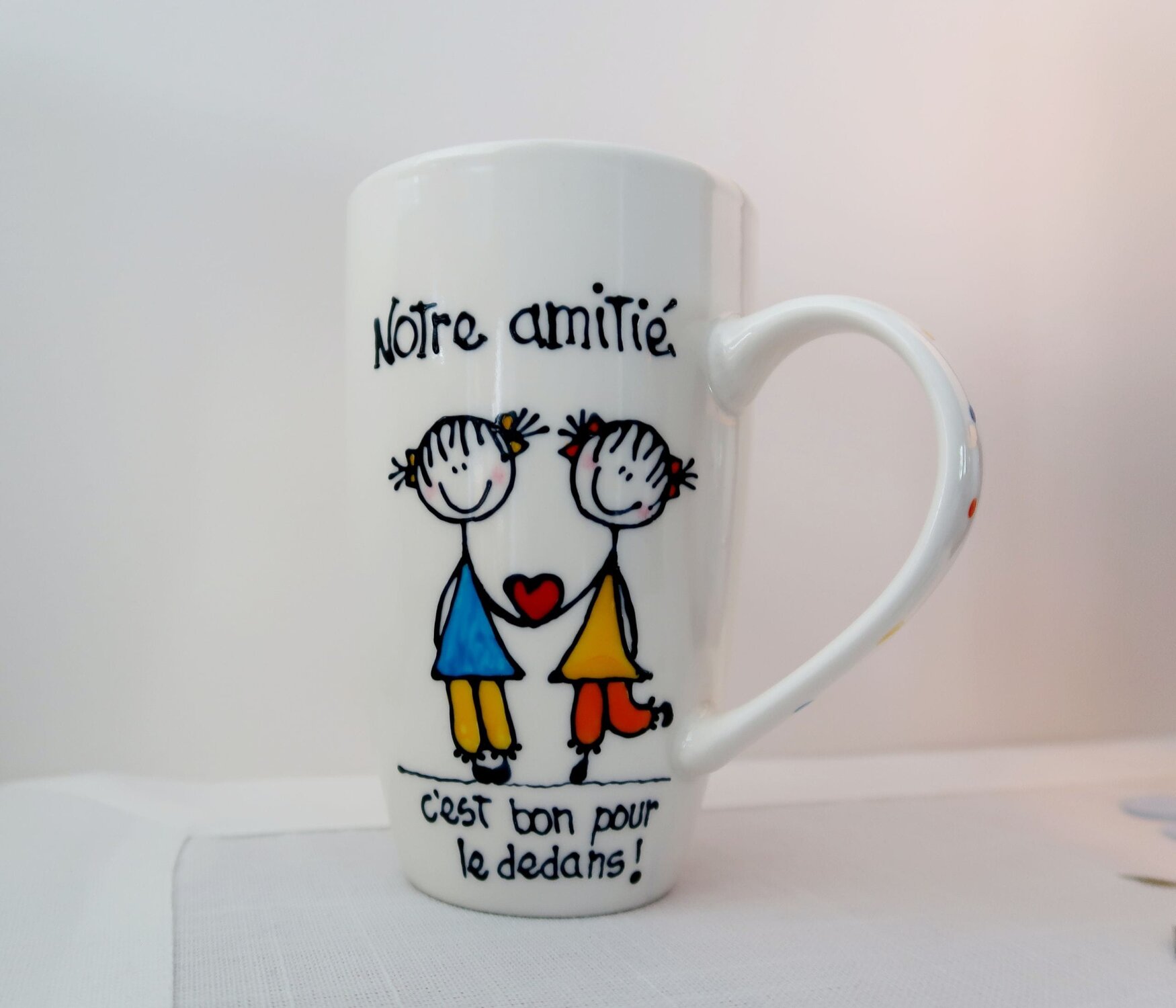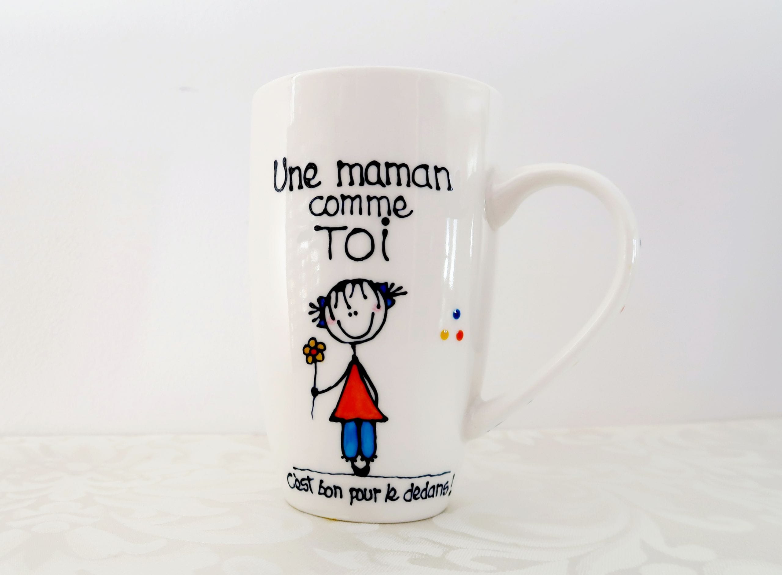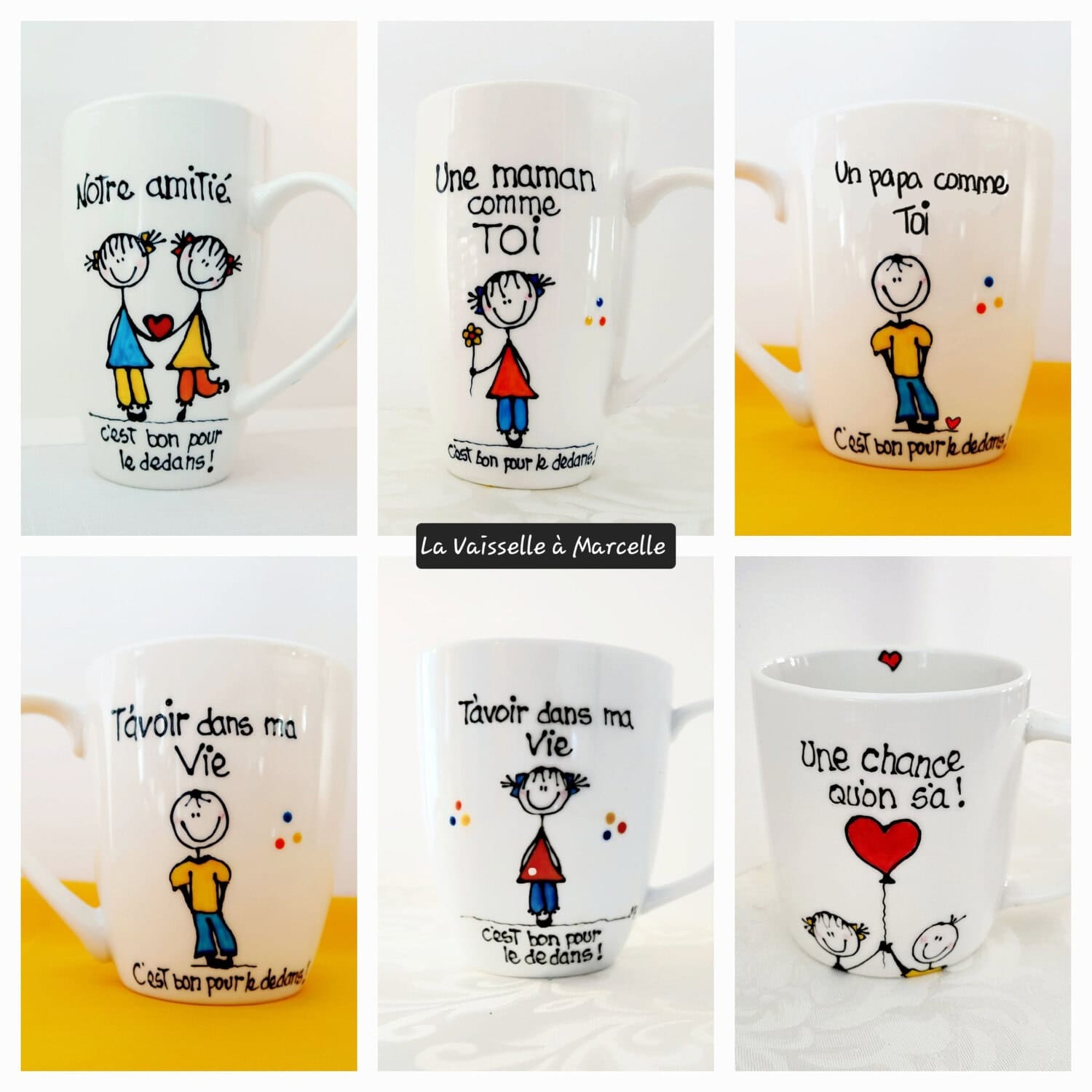 Tasses peintes à la main aux thèmes d’amitié, d’amour et de famille. (2 exemplaires de chaque modèle)Le personnage féminin (Mariléo) est la petite mascotte de mes recueils “Bon pour le dedans” (NOTE: la largeur indiquée inclus l’anse de la tasse)
