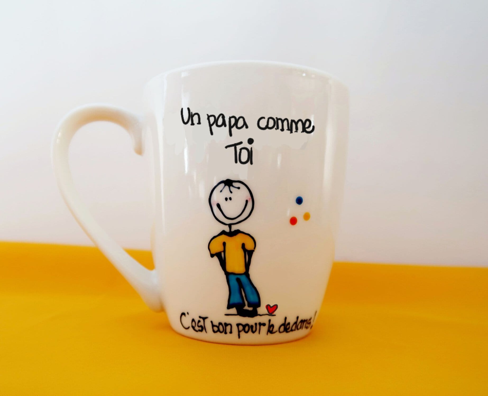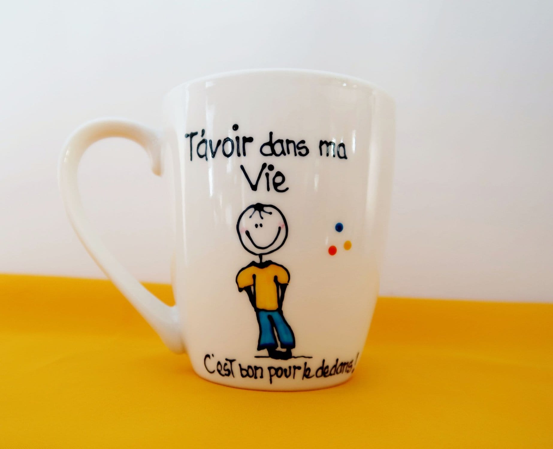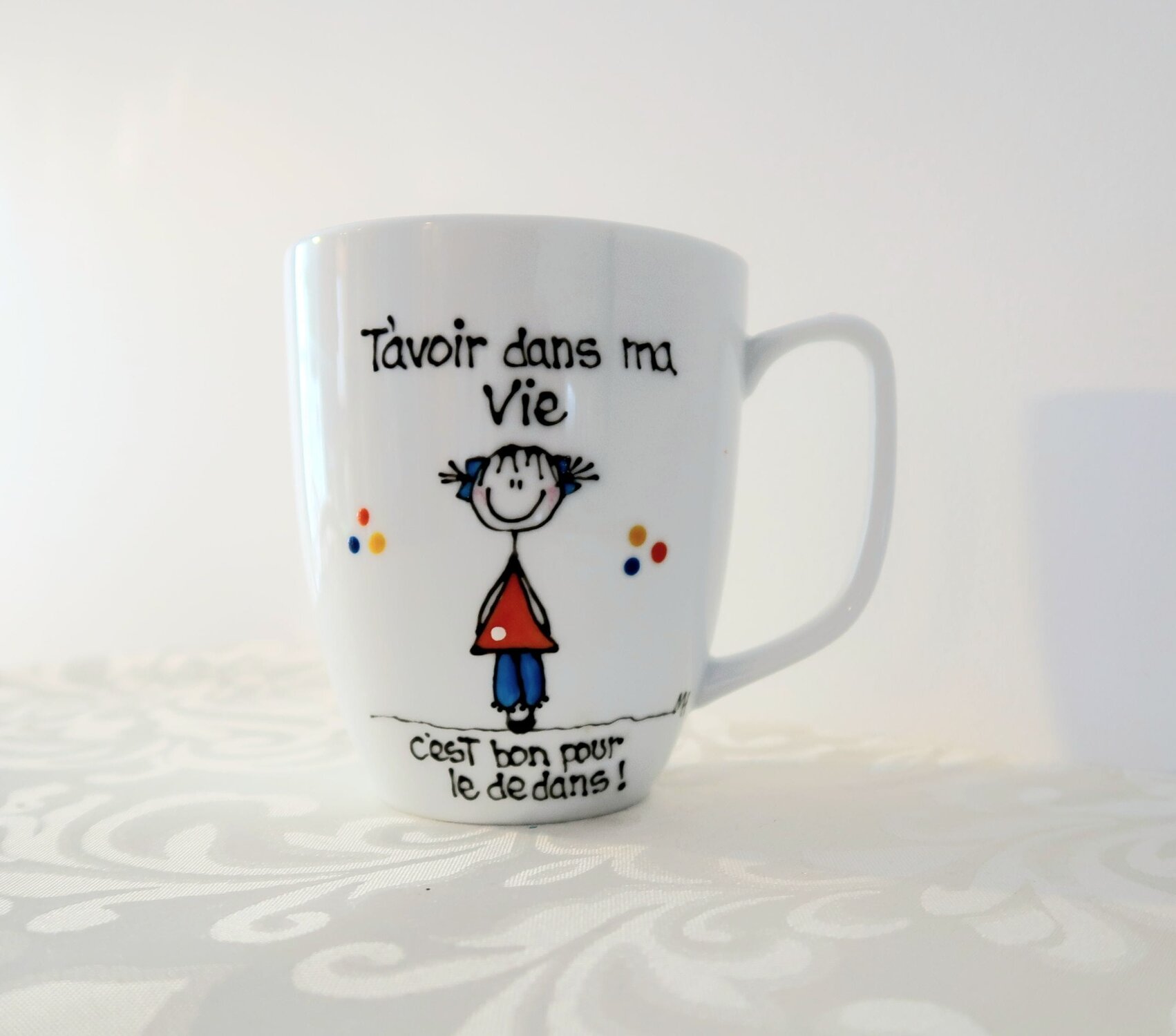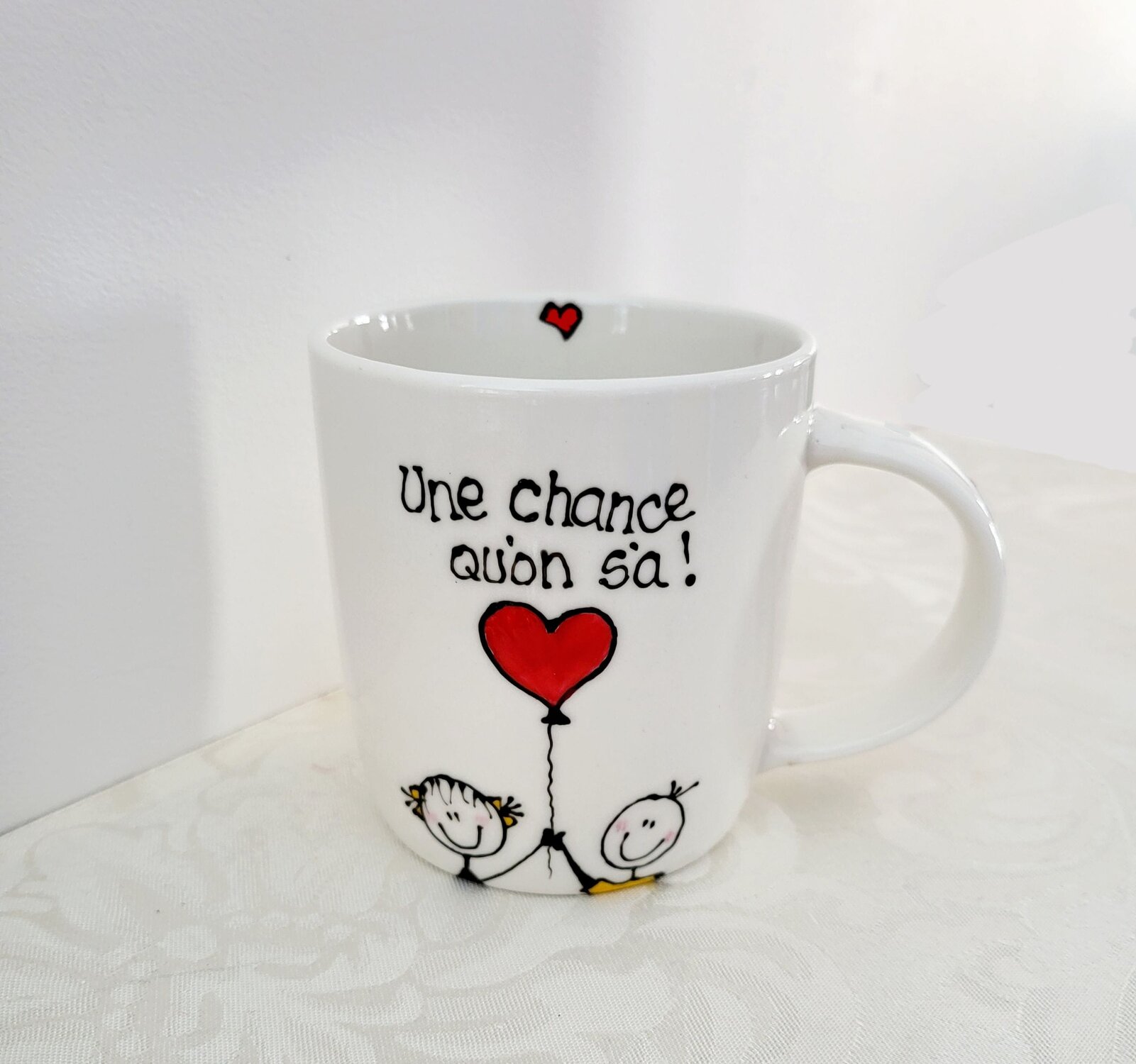 Tasses peintes à la main aux thèmes d’amitié, d’amour et de famille. (2 exemplaires de chaque modèle)Le personnage féminin (Mariléo) est la petite mascotte de mes recueils “Bon pour le dedans” (NOTE: la largeur indiquée inclus l’anse de la tasse)