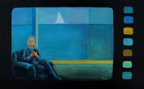 Livrée sur toile non encadrée. Cette oeuvre fait partie de la série “Conversations” qui traite de notre relation avec les écrans. Pour plusieurs, c’est la seule façon de voyager.